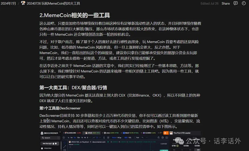 至于具体的工具方面,话李话外前几天(7月26日)的文章已经给大家梳理了玩转 MemeCoin 的 20 大工具,感兴趣的小伙伴可以回看历史文章。如下图所示。