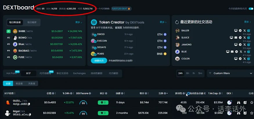 当然,上面统计的也仅是 CoinGecko 收录的 MemeCoin 数量(1600个左右),但实际上,链上目前的 MemeCoin 币种数量非常地多。根据 DEXTools 平台的统计,目前正在提供流动性交易的币种(主要是 MemeCoin)有 5,563,714 种。如下图所示。