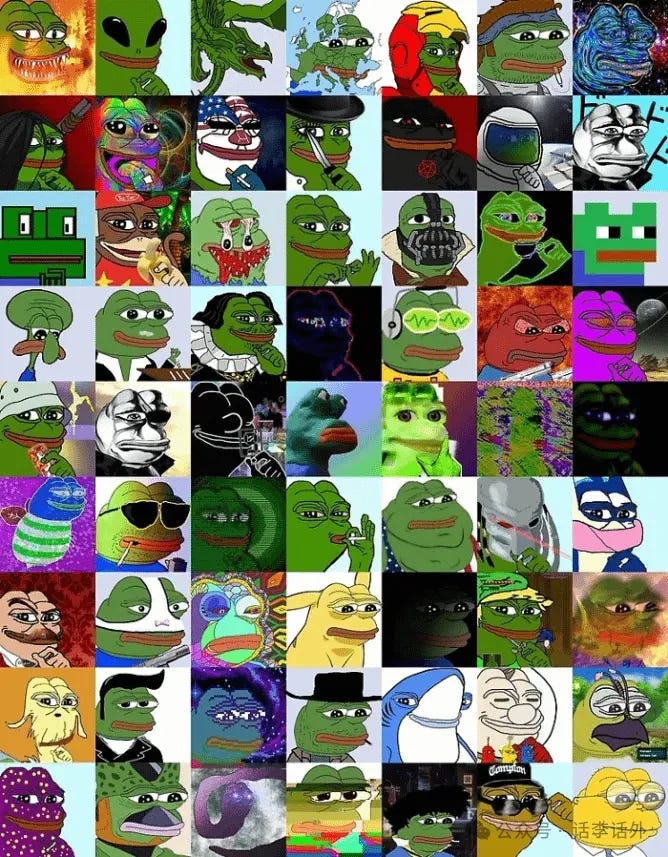 一个成功的 MemeCoin 似乎就不该给自己设计太多的严肃用途,如果一个刚出现的 MemeCoin 的项目方也宣称自己拥有强大的团队、各种合伙伙伴或投资机构、未来还要搞什么 XX 生态建设,那么最好远离,与其买这种 MemeCoin 不如去选几个热门赛道头部的山寨币。比如 PEPE 就是一个很好的例子,因为它的全部概念似乎就只是一只表情夸张的青蛙,这有助于吸引更广泛的受众,同时还可以衍生出更多的搞笑表情。如下图所示。