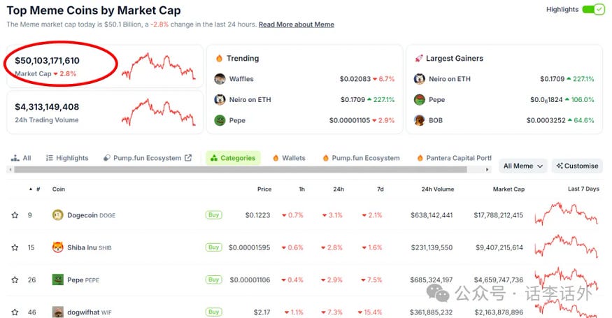 目前,Memecoin 板块(CoinGecko 平台收录的 1600 个 MemeCoin 代币的市值总和)的总市值已经超过了 500 亿美元,远超过了一些热门叙事板块,比如 AI 板块当前的总市值为 257 亿美元、RWA 板块为 71 亿美元、DePin 板块为 211 亿美元。如下图所示。