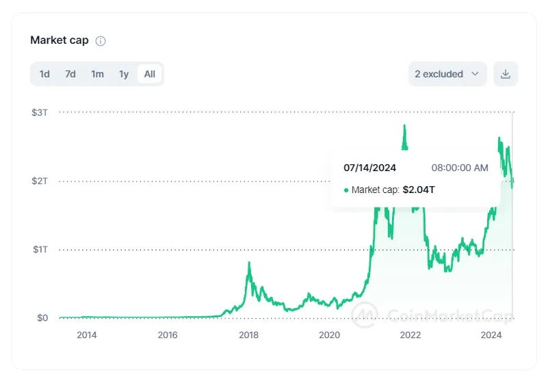 同样的道理,目前加密市场的总市值(不包括USDT及USDC)为 2 万亿美元,如下图所示。很多人目前都期待美联储降息能够给这个市场带来大量的流动性,但也并不是说,我们还需要 2 万亿美元的新资金体量才能够使加密市场的市值再翻一倍。其实,只要在一定的新流动性基础上,再加上新一轮的需求炒作,完全就可以重新推高加密货币整体的市值。