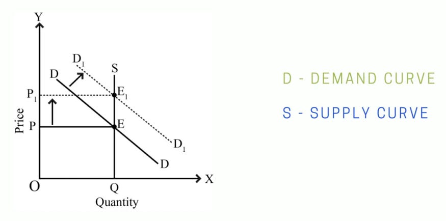 这里面会涉及到一个流动性与资产定价的经济学关系,简单来解释就是,当一种资产的供应量已经固定的时候,那么需求就会成为价格的决定性因素。当供给具有弹性且需求增加时,价格不会变化,但需求量会增加;而当对供应缺乏弹性(即供应量固定)且需求增加时,则会导致价格上涨,并进一步使价格达到新的平衡点。对应到上图,在 S(供应)保持稳定的情况下,当需求从 DD 增加到 D1D1,那么价格就会达到新的平衡点,即从 E 达到 E1。