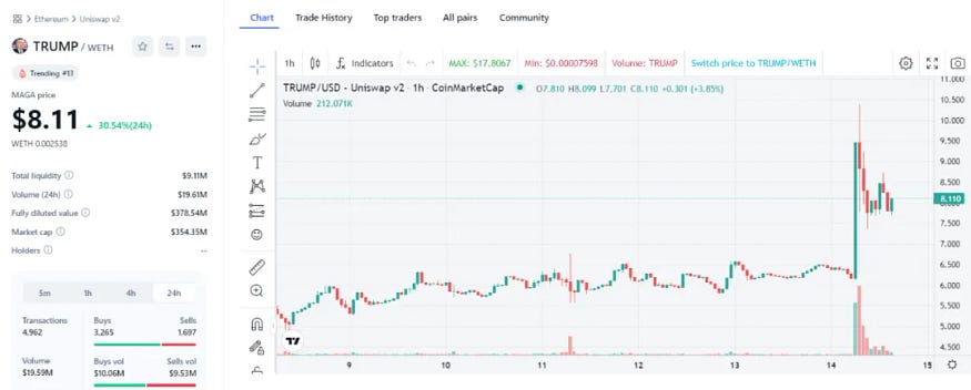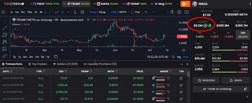我们还是以上图中显示的 MAGA(TRUMP)代币为例,截止撰写本文章时,该代币价格是 8.11 美元、在 Uniswap 里面的 TRUMP — WETH 流动池为 910 万美元,市值为 3.54 亿美元。如下图所示。