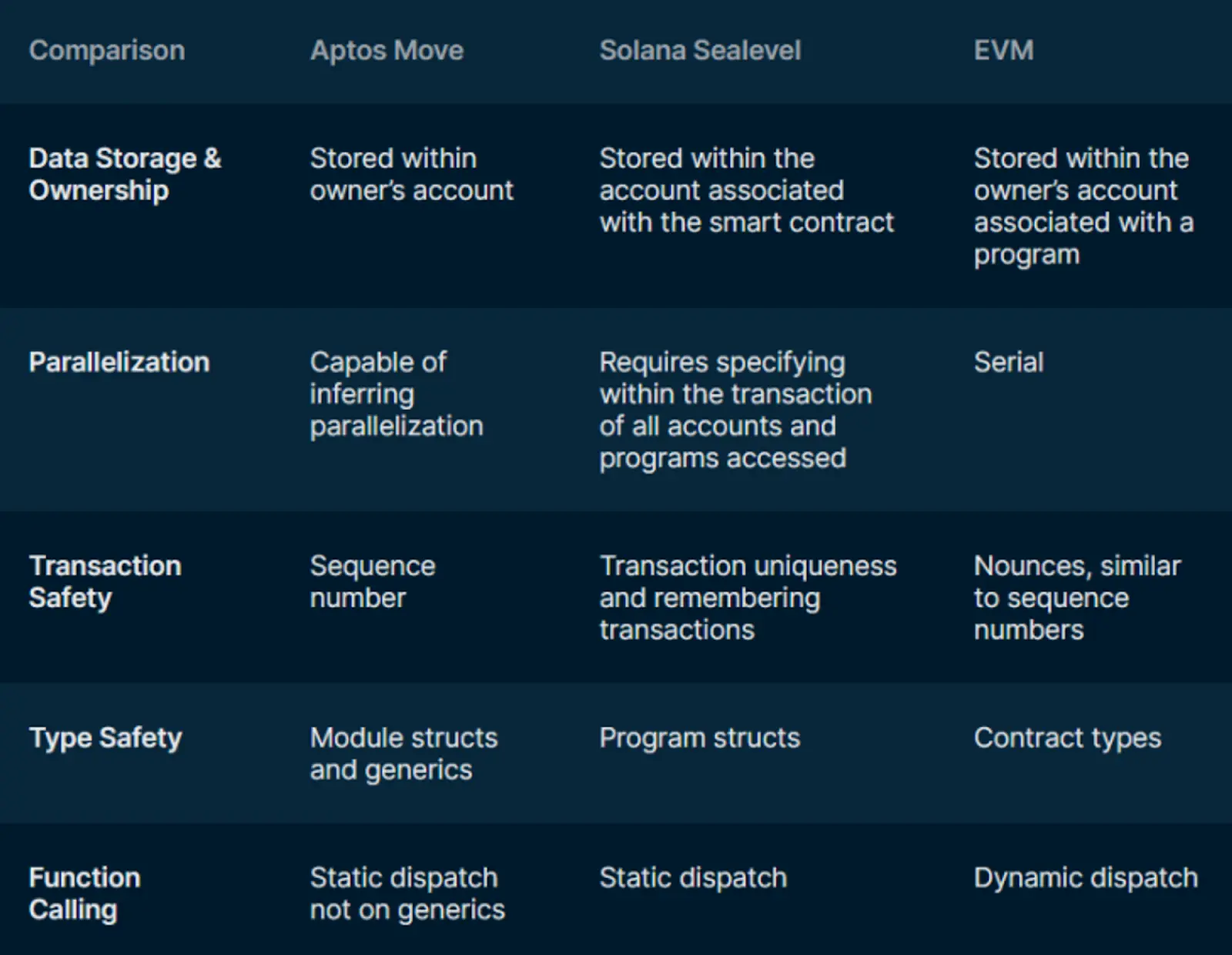 安全性: Move 语言设计的大前提在于安全性,它使用静态类型检查和资源管理来防止常见的安全漏洞,例如溢出错误和重入攻击。对比于其他语言虚拟机,Move支持多种安全功能,下图引用Nansen的对比。