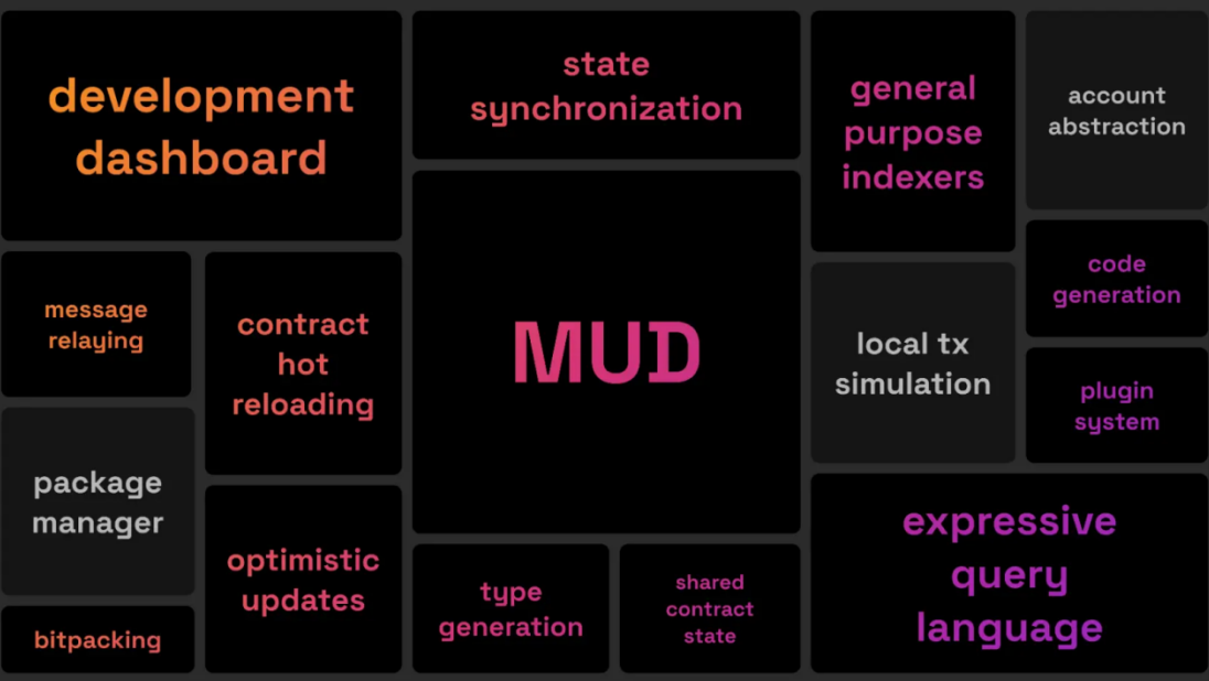 MUD 引擎的诞生来自于开放者们对过去以及现有问题的思考,MUD 是一个构建复杂应用的以太坊应用程序的框架。MUD 提供了一些组织数据和逻辑的约定,并抽象了低级复杂性,使开发者可以专注于应用程序的功能。它标准化了链上数据的存储方式。有了这种标准数据模型,MUD 可以提供所有网络代码来同步合约和客户端状态。