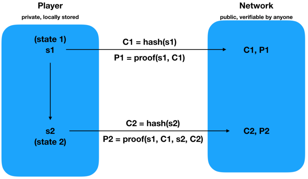 比如当玩家想要采取行动时,受到黑暗森林的法则影响,玩家不能暴露自己的坐标,却要从 A 星球移动到 B 星球,他们需要提交 A 跟 B 的坐标以证明这是有效的,但以太坊的区块信息是完全透明的,《Dark Forest》则通过以下方式去实现信息隐藏。玩家选择要离开的星球和目的地星球,这两个星球的位置是玩家的私有信息。计算要离开的星球和目的地星球的位置的哈希值,然后将这两个哈希值提交到区块链。在这个阶段,玩家会提交一个承诺(Commit 阶段),由于哈希函数的单向性,这些提交的哈希值不能用来确定玩家的实际行星位置。而下一个阶段是验证(Reveal 阶段),在此阶段,玩家生成并提交一个零知识证明,证明他们的行动是有效的。这个证明可以被任何人验证,但不会透露任何关于玩家星球位置的信息。
