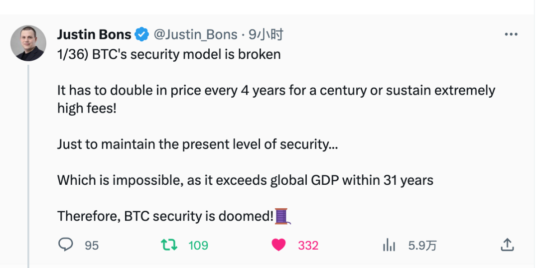 - 1/36) BTC 的安全模型被打破, 一个世纪以来,它的价格必须每四年翻一番,否则就要承受极高的费用!只是为了维持目前的安全水平......这是不可能的,因为它在 31 年内就超过了全球 GDP。因此,BTC安全性已成定局