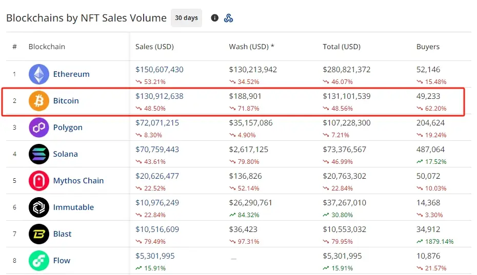 Ordinals是一个能让人们能够在比特币上铸造类似于以太坊上的 NFT 的协议。在过去一个月中,比特币Ordinals在NFT生态系统中表现抢眼,以130,912,638美元的交易量稳居第二,超越了Polygon和Solana,仅次于以太坊NFT生态。这一数据表明比特币生态系统在NFT市场中的地位日益提升。