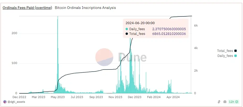 Ordinals对比特币的重要性常常被低估,因为它为矿工引入了新的费用流。由于文件大小和费用之间的相关性,将数据包含在比特币区块中的成本可能会很高。数据显示,迄今为止,通过记录 Ordinals 向矿工支付的总费用已超过 6,865 BTC。这不仅增加了矿工的收入,也进一步推动了比特币网络的活跃度。
