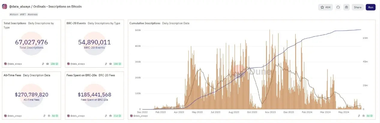 数据显示,截至6月24日,铭文数量已超过6700万,似乎没有任何放缓的迹象。这一增长主要得益于BRC-20代币和主流钱包陆续支持Ordinals协议。像UniSat,它允许散户轻松购买Ordinals和BRC-20代币并将其上链,进一步推动了铭文市场的繁荣发展。