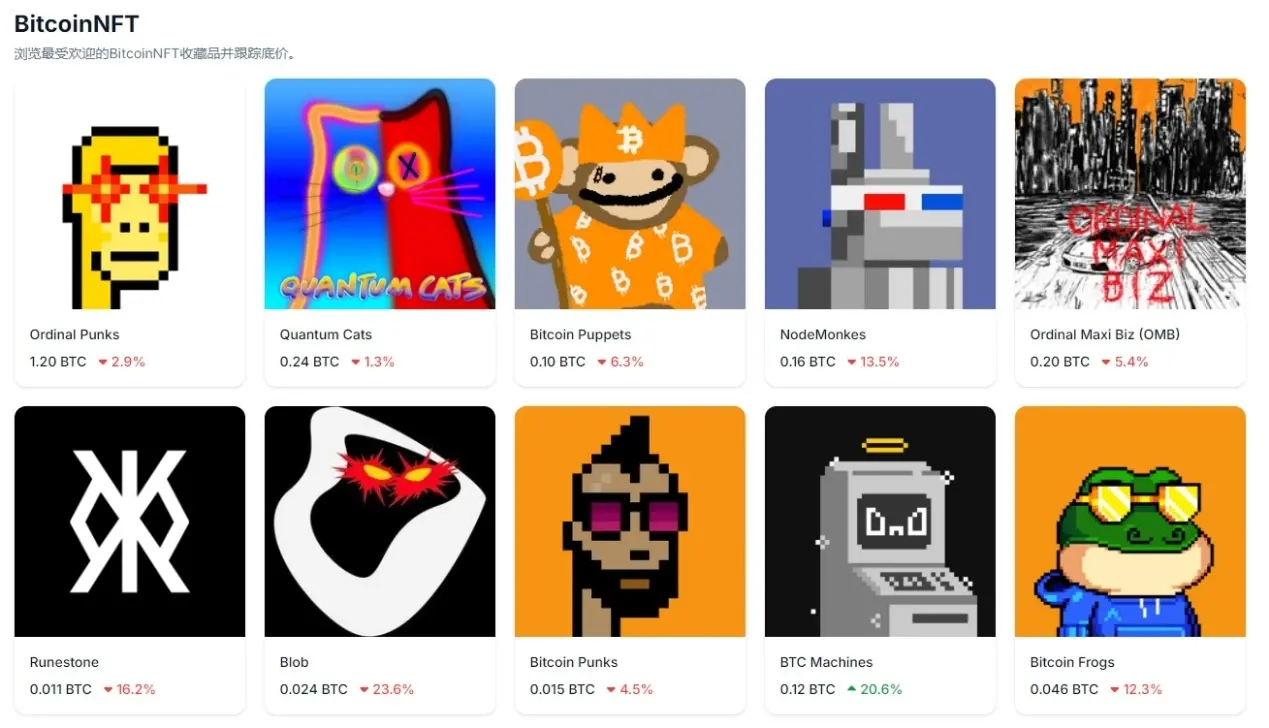 据coingecko显示,目前受欢迎的比特币NFT包括Ordinals Market 、Quantum Cats、Bitcoin Puppets、NodeMonkes等。