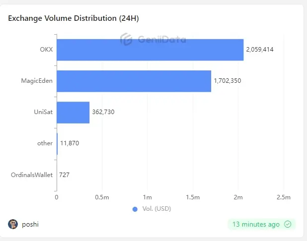 据GeniiData数据显示,截至2024年6月24日,OKX的日内交易量为205.9万美元,Magic Eden为170.2万美元,UniSat为36.2万美元。目前,OKX稳居首位,拥有最多的Ordinals用户。