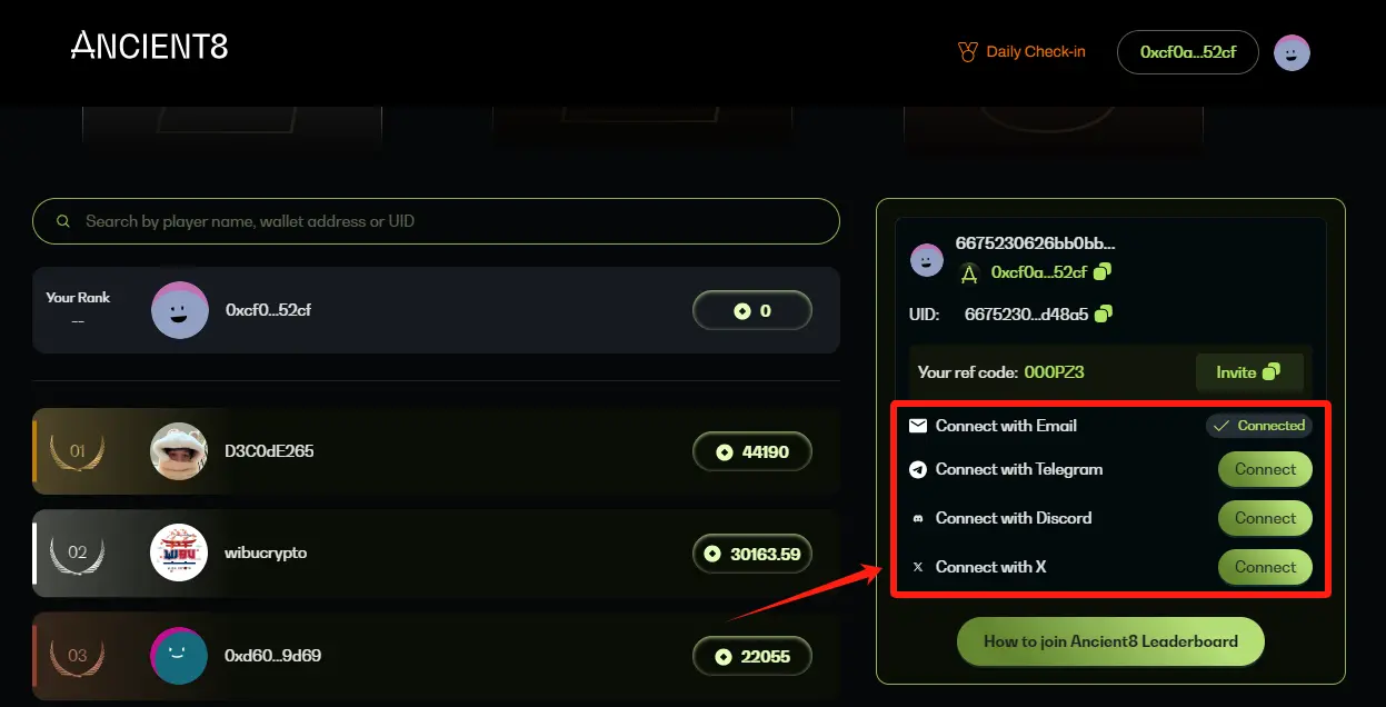 依次连接您的电子邮件、Discord、Telegram 和 X(Twitter)账户。