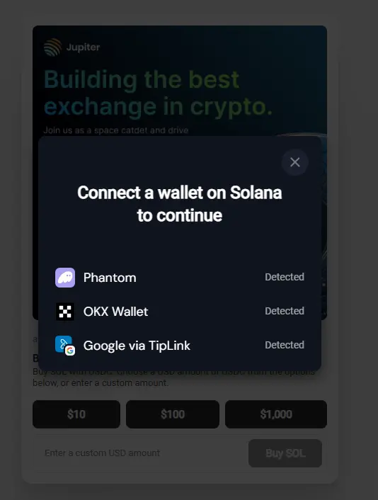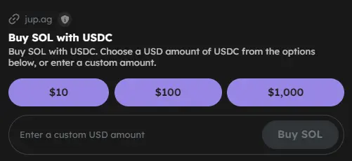 这里MetaHub官推用 Jupiter 的网址做了示例,当你打开钱包插件的开关,并刷新页面就能看到支付接口。
