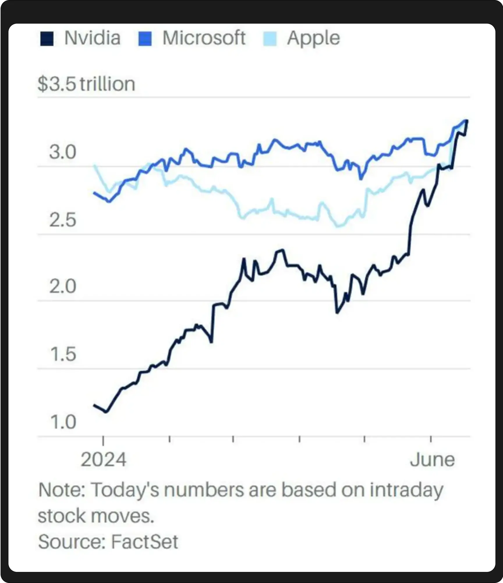 6 月 18 日,英伟达(NVDA)股价上涨 3.51% ,市值达到 33353 亿美元,超过微软和苹果,成为全球市值最大的公司。此时距离 6 月 5 日英伟达市值超越苹果,成为 3 万亿美元市值俱乐部成员,仅过去了不足两周的时间。毫无疑问,在这场颠覆性 AI 变革的叙事中,英伟达可谓是吃尽了红利,成为市场用真金白银投票出来的时代骄子。