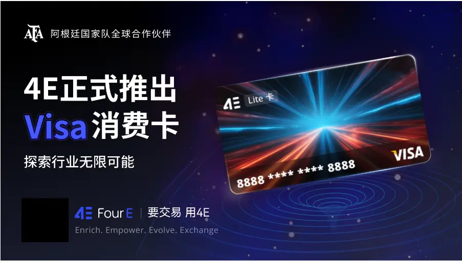 4E金融卡基于4E一站式资产交易平台,拥有强大的团队背景与雄厚的资金:持有合规牌照,与GBE深度合作,符合欧盟级别的监管要求与标准。同时4E在业内有良好的口碑和知名度,是阿根廷国家队全球合作伙伴。
