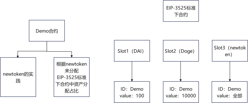 举个例子,在 EIP-3525 背景下,将一个合约抽象为一个 ID 进入 Slot 内部,将这个合约记作 Demo。由于一个 ID 可以对应多个槽的资产,那么 Demo 合约将 100 个 DAI 和 10000 Doge 存入 EIP-3525 标准下的合约的时候,Demo 的资产可以抽象成十份,每一份都对应着 10 DAI 和 1000 Doge,那么如果 Demo 合约发行了一个代币,根据这个新代币来进行去中心化管理 Demo 合约资产的占比,去获取这十份当中的一份,就可以牟定 DAI 和 Doge 进行相对的稳定发展了。