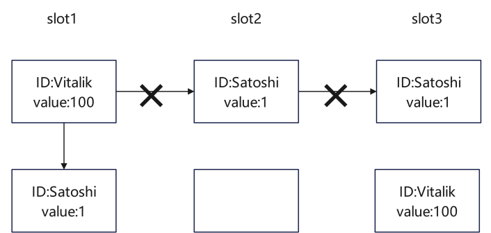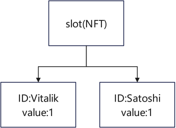 就好比 Vitalik 和 Satoshi 两个人各办了一张银行卡在 Slot1 内部,那么就可以进行转账操作,但是跨银行的转账操作不能直接在这个合约内部执行。虽然每个 ID 都有自己的 Value,但同一插槽下的不同 ID 可以视为相同,可以交换、组合和拆分,下面图中箭头表示的是转账。