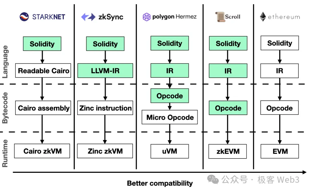 反之, zkVM 是自己定义了一套指令集 / 操作码,它自定义的指令集可以做的很简单,可以很 ZK friendly,你做出来一套 zkVM 后,不必频繁的更改底层代码,就能支持各种升级和预编译。所以 zkVM 的主要工作量和后续升级维护的难度,就放在了编译器也就是把智能合约转化为 zkVM 操作码的那一步,这和 zkEVM 有很大不同。