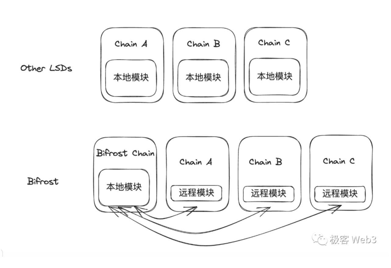 这些操作,用户完全感觉不到背后的跨链传递过程,一切就像在本地完成一样,大家可以通过 Omni LSD dApp 去体验一下。Omni LSD dApp 目前支持在 Ethereum、Moonbeam、Moonriver、Astar 上远程铸造/赎回/兑换 vToken。如果没有上述功能,用户如果想在 Moonbeam 上铸造 vDOT,必须手动操作三步,很麻烦!① 把DOT从Moonbeam跨链转入Bifrost而通过远程调用功能,用户的资产看似无需离开 Moonbeam 链,即可完成上述三个步骤, 直接在 Moonbeam 链上将 DOT 转换为 vDOT 。也就是说,整个过程,用户就像在使用 Moonbeam 本地应用一样体验 Bifrost 链上的服务。听起来很酷吧!可这怎么实现呢?其实也不复杂,Bifrost 在其他链上部署了一个远程模块(remote modular),用于接收用户请求,并跨链传递给 Bifrost Parachain,流动性质押模块处理完成后,再将结果跨链返回远程模块。用户只需在远程链上发起请求,后续的过程,会由 Relayers 触发并完成。Bifrost 将其架构称为“全链架构”,与其他 LSD 协议的多链部署策略的对比如下图:之所以这么浓墨重彩的讲 Bifrost 的架构,是为了让大家彻底理解 Bifrost 所说的“全链架构”是怎么回事,Bifrost 的架构所代表的其实是一种全新的通用范式。Chainlink 在其博客文章《跨链智能合约》一文中,曾将这种架构描述为“总店+分店”模型。应用程序的主要逻辑放在一条链上,就像一个“总店”,然后其他链上提供一个远程访问模块,以实现与终端用户之间的交互(获取用户输入,输出用户想要的结果),就像一个个“门店”。