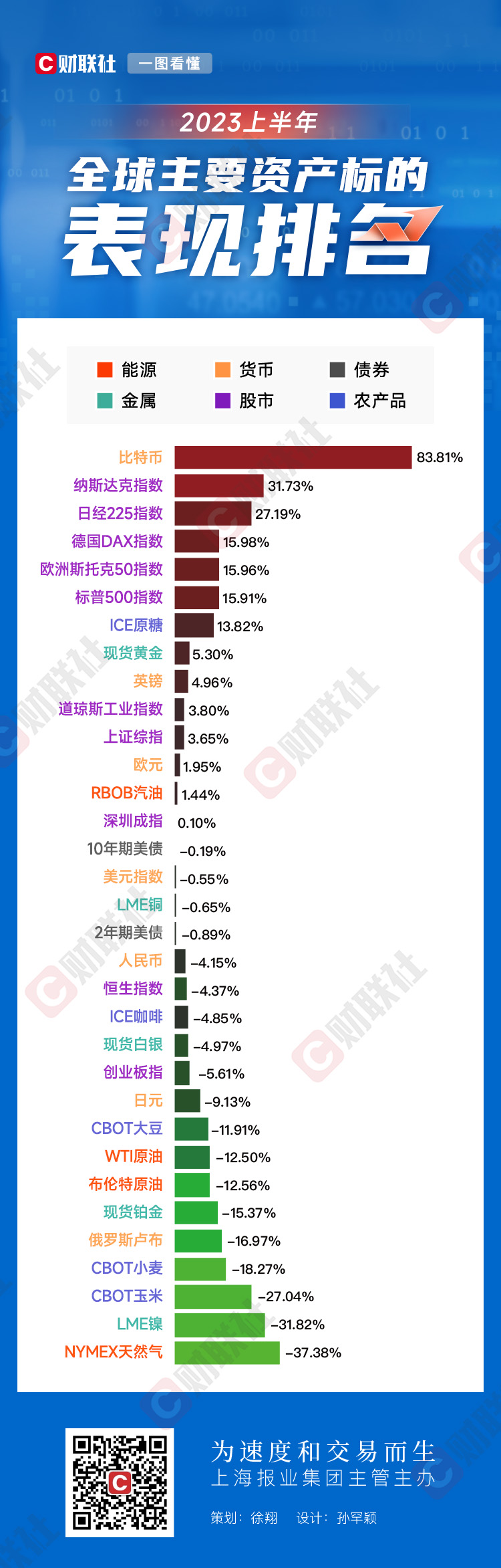 萌币网 消息,据财联社发布的「2023 年上半年全球主要资产涨跌榜」,图中显示比特币在全球主要资产标的中表现排名第一,涨幅为 83.81%,远高于第二名纳斯达克指数(涨幅为 31.73%)。