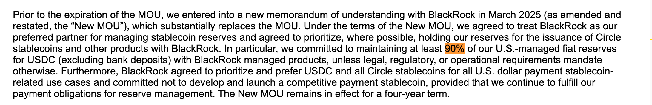 萌币网 消息,据 Circle 4 月初提交的上市报告文件显示,Circle 与贝莱德(BlackRock)在 2025 年 3 月签署的新谅解备忘录(New MOU)中约定,Circle 优先将其发行 Circle 稳定币和其他产品的储备交给贝莱德,其承诺,除非法律、监管或操作要求另有规定,否则 Circle 至少将 90% 的美国管理的 USDC 法币储备(不包括银行存款)存放在贝莱德管理的产品中。此外,贝莱德同意在所有与美元支付稳定币相关的使用案例中,优先考虑并优先使用 USDC 和所有 Circle 稳定币,并承诺不开发和推出具有竞争性的支付稳定币,前提是 Circle 继续履行准备金管理的支付义务。新谅解备忘录的有效期为四年。