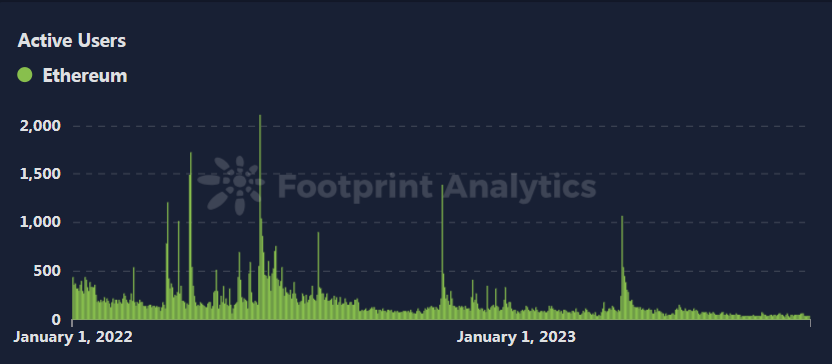 从该图中可以看到,虽然近段时间链游有复苏迹象,但从总体来说,2022年到现在,GameFi 赛道始终是低迷的状态,而 Gala 的活跃用户数(此数据来源于进行链上合约交互的地址数,即使用 Gala进行购买的地址,对于中心化的 Gala 平台来说肯定是不准确的,肯定是比实际活跃用户少的,但是对于我们这里的趋势判断是具有借鉴意义的)也进行了一个很大幅度的下降并且目前维持了很长一段时间的平稳状态。