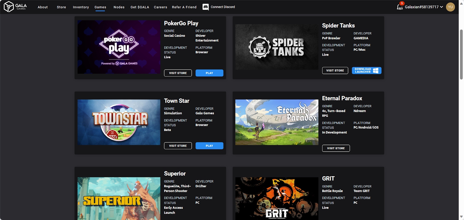 截止目前,虽然一部分游戏还在开发中,Gala Games 官网已经确定上线了18款游戏,游戏类型包含了角色扮演、模拟经营、卡牌、塔防、射击等类型,除了今年在链游圈爆火的 Spider Tanks,Gala Games 还与传统游戏平台 Epic 合作,推出了类似于 PUBG 的大逃杀游戏 GRIT。