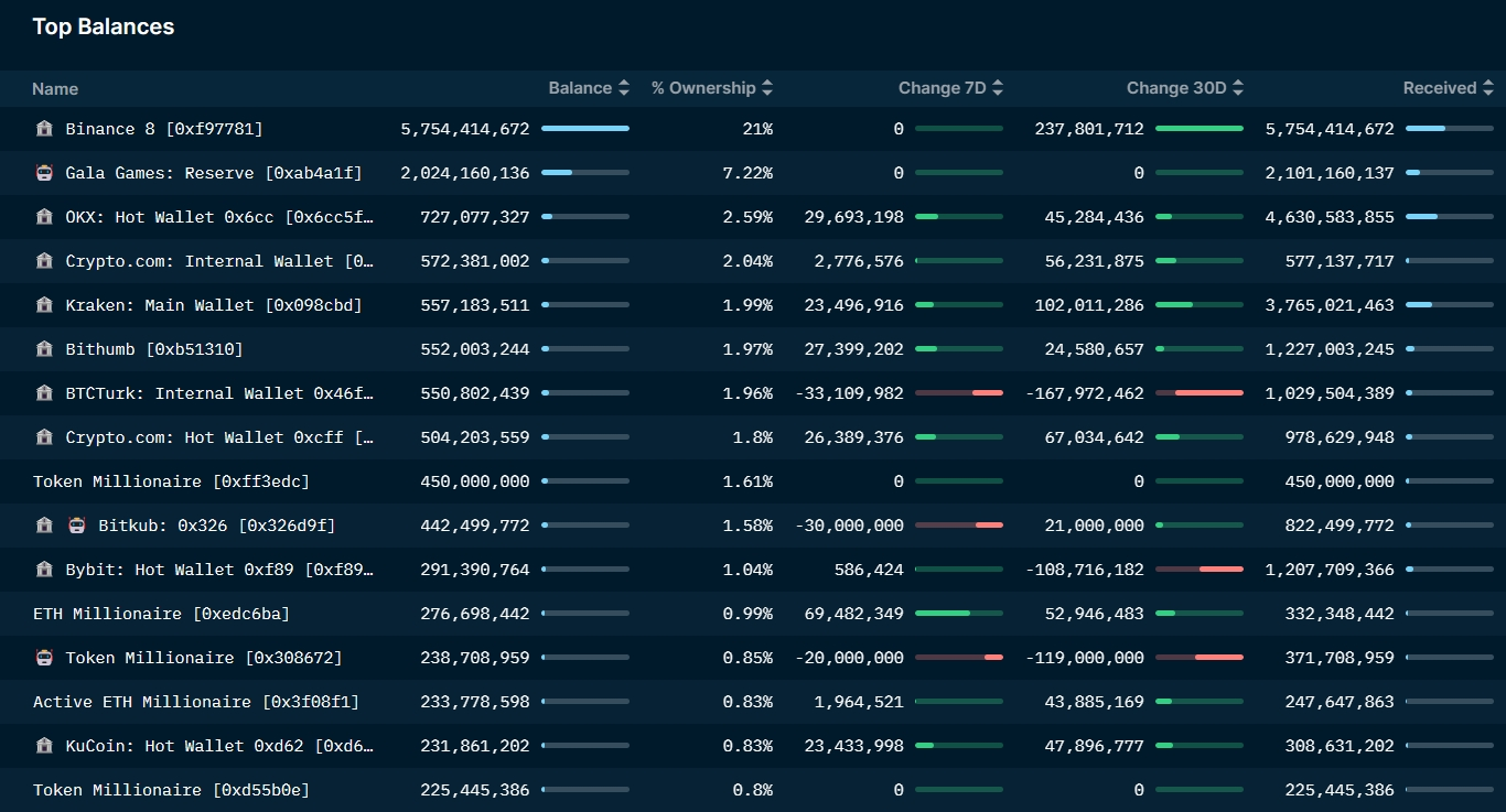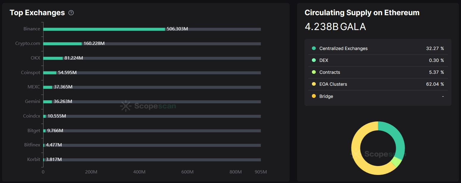 同时,根据 Scopescan 数据,CEX 中的 $Gala 持仓量占到了总量的 32.27%,而在 CEX 中,持仓最多的交易所为 Binance。Binance 也是 Gala 的第一大持币地址,占到了总量的 21%。