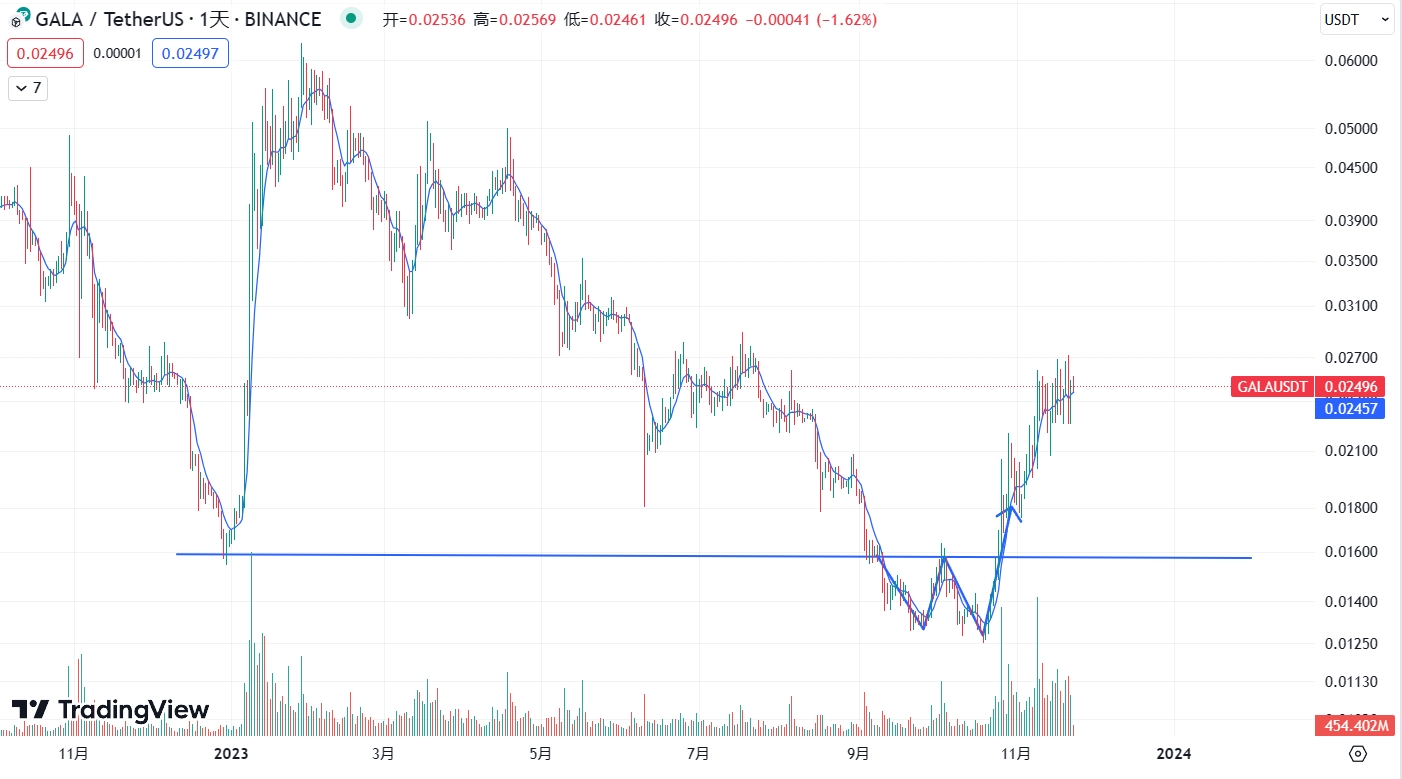 根据 Trading View 数据,在 Binance 现货中 $Gala 在10.19日时触底,并在接下来的行情中开始放量拉升,目前价位约 $0.025,较底部反弹约 100%,底部形成标准 W 底结构,颈线触及上一段下跌行情的强支撑点。我们容易看出,$Gala 大概率已经筑底完成,为迎接牛市做好了准备。