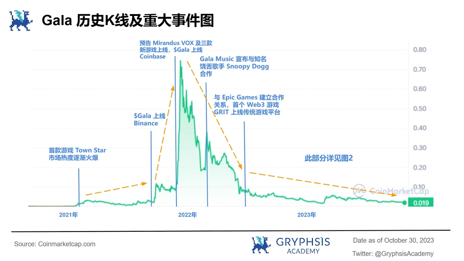GameFi 赛道在上一轮牛市中炒作的基本逻辑就是 P2E 玩赚机制,因为玩游戏可以赚钱,链游吸引了一大批人蜂拥而至,代币价格水涨船高。Gala 也是“蹭”到了 P2E 机制,在上一轮牛市中达到了千倍的涨幅。为什么要把蹭字加上引号?因为 Gala 团队的理念跟绝大多数链游不一样, Gala 其实并不注重 P2E,就以 Town Star 为例,虽然是免费游玩,但是要做到资源的平衡却是难上加难,玩家很容易在运营中陷入死局,游戏更重视玩家的游玩体验而不是快速赚钱。Gala 真正的愿景一直是制作人们真正想玩的区块链游戏,这是 Gala 团队永远不变的初心。