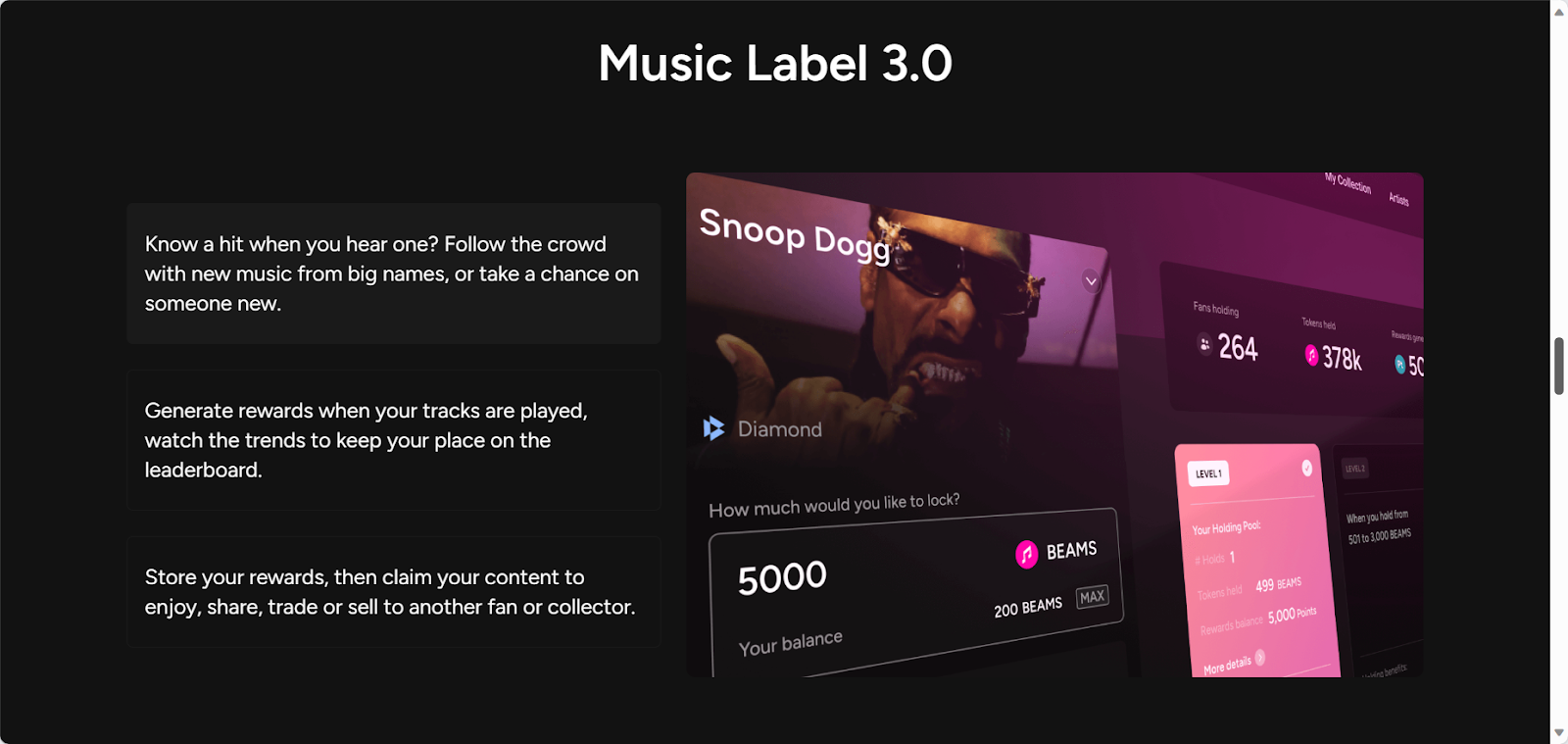 Gala 把电影和音乐都搬到了区块链上并签约了很多艺人,如 Gala Film 的 The Rock 巨石强森,以及 Gala Music 的 Snoppy Dogg,玩家可以购买电影或音乐专辑的 NFT,在看电影或听歌时可以获取奖励,“Watch to earn” or “Listen to earn”。