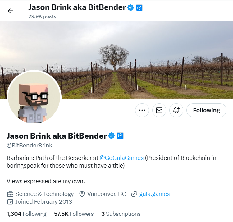 Gala 的区块链总监 Jason Brinks。在社交媒体上 Twitter 上,Jason 一直是 Gala 的代言人,甚至可以说是公关代表,与关注 Gala 的人交谈有关 Gala 的一切,Gala 的 AMA 也是大多由 Jason 主持。 Jason曾在联合国工作,其加入 GALA 的主要动机是游戏赚钱有可能使发展中国家的人们脱贫。他看到了这些国际组织的腐败,希望去中心化自制协议最终取代它。
