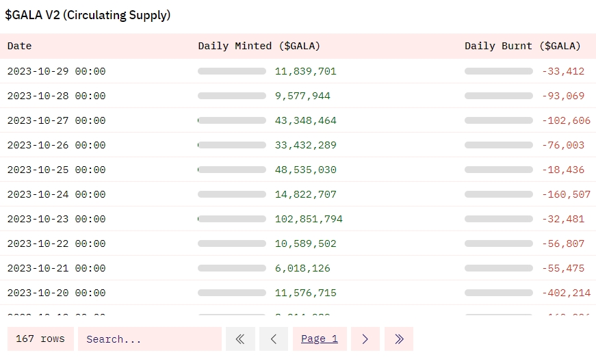 $Gala 在今年 5.15 进行了从原始 $Gala 代币到新的 $Gala 代币的智能合约升级,也就是Gala V2 升级。上图的看板中准确的记录了合约置换前后以及从 2020.9.11 日 Gala 开始铸造起到现在的每日铸造数量和燃烧量,目前已经是开始铸造的第 948 天,总铸造量约为 483 亿个,总流通量约为 273 亿个,最大供给量依然为 500 亿个。