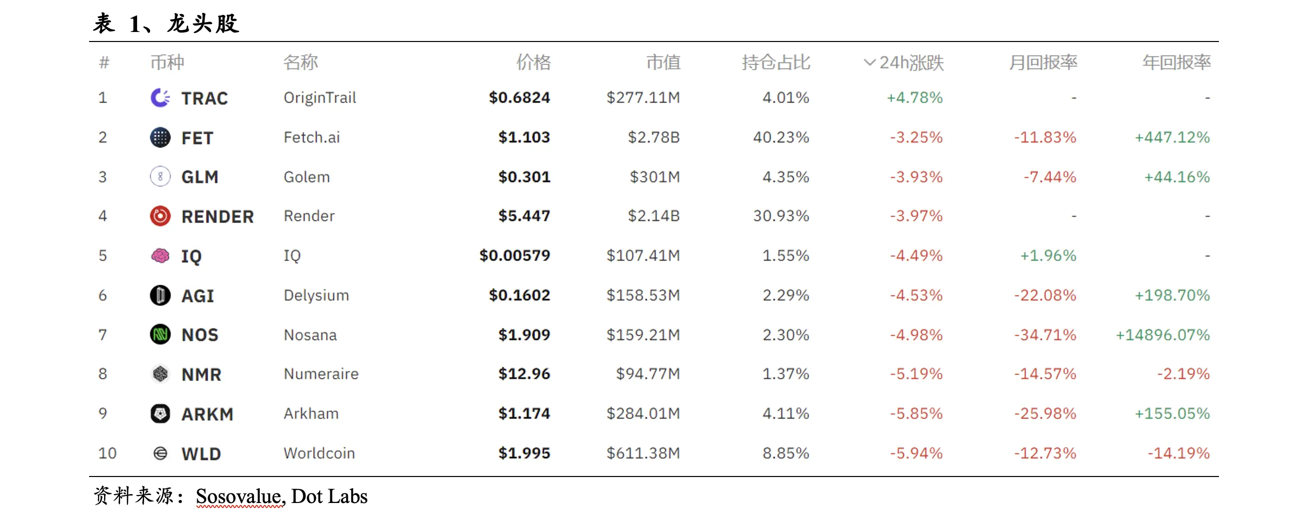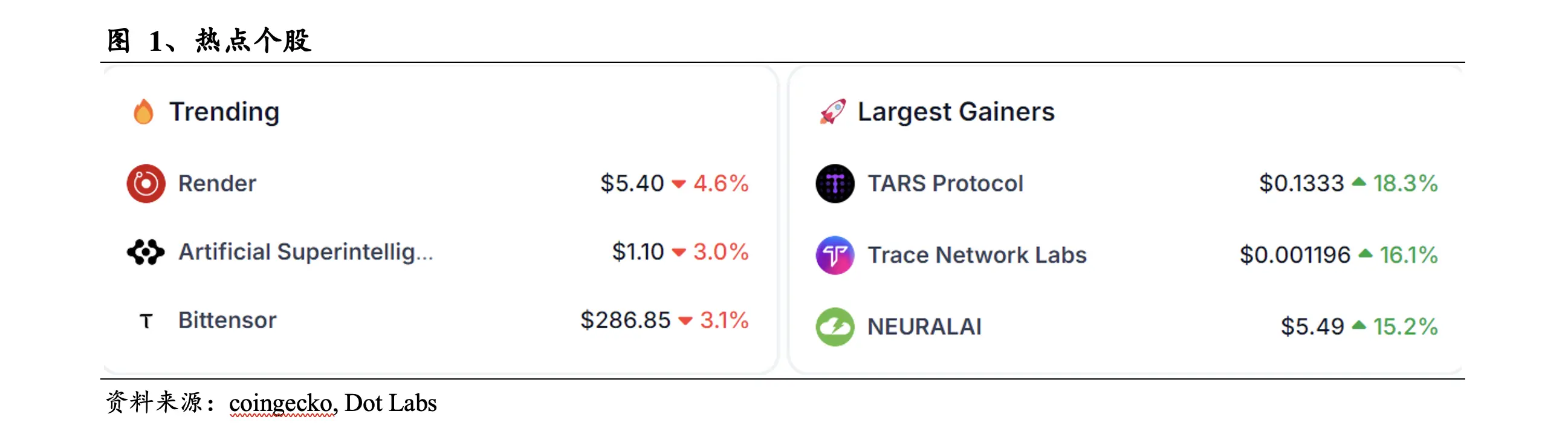 今天热点个股是Render、Artificial Superintelligence Alliance和Bittensor,涨幅领先是TARS Protocol、Trace Network Labs和NEURALAI。