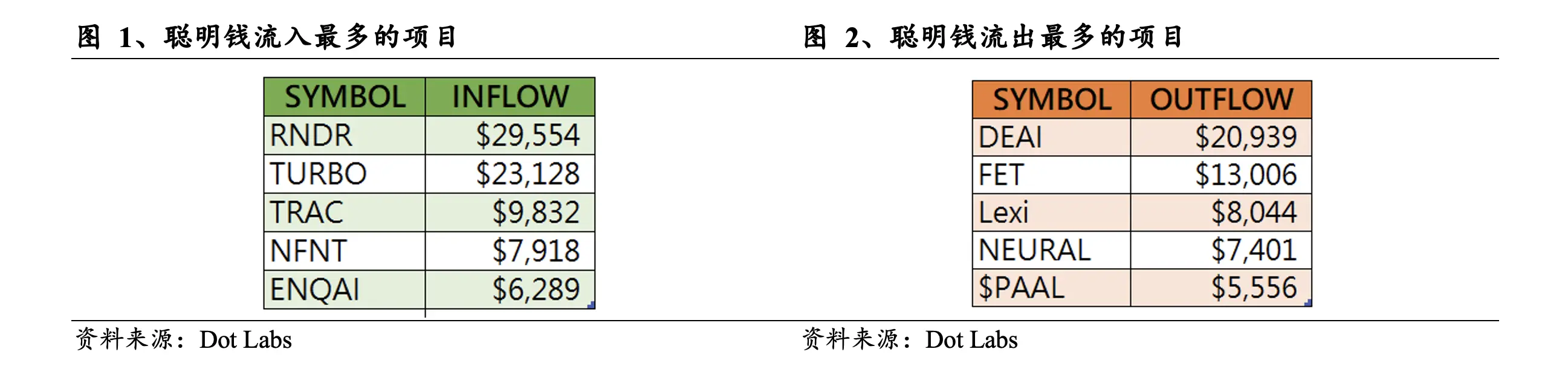过去24小时聪明钱流入最多的项目是RNDR、TURBO、TRAC、NFNT、ENQAI;聪明钱流出最多的是DEAI、FET、Lexi、NEURAL、$PAAL。