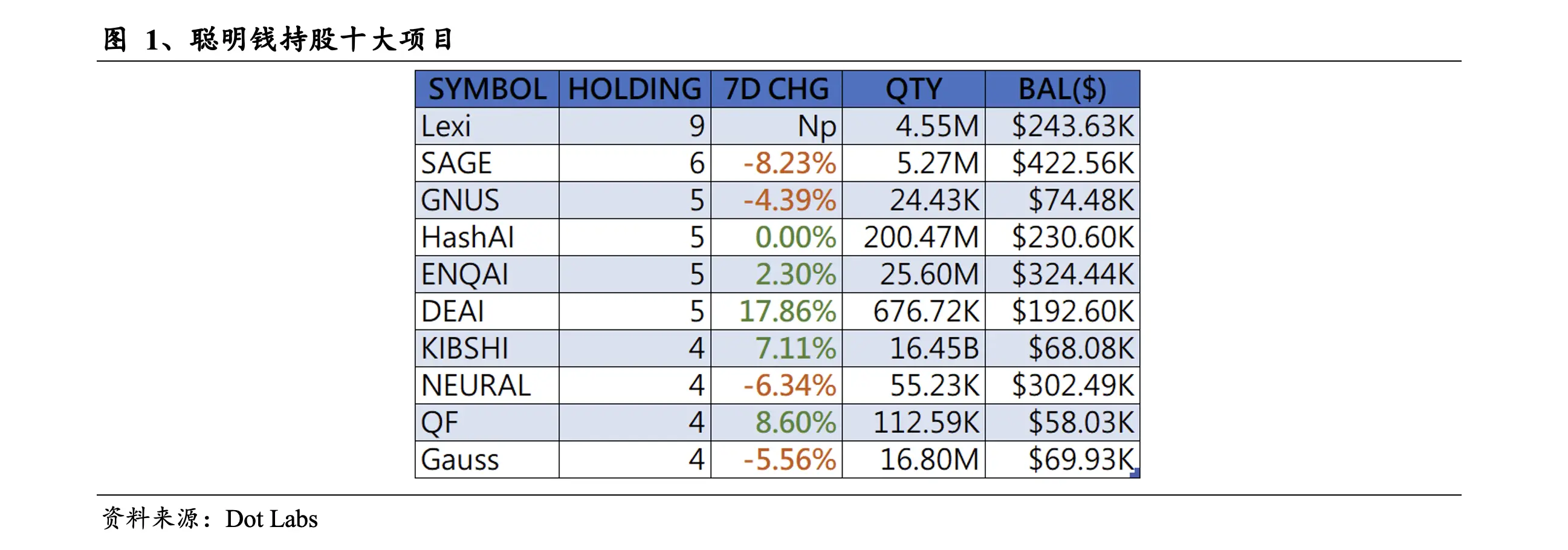 本期聪明钱持股十大榜单中的项目分別是Lexi、SAGE、GNUS、HashAI、ENQAI、DEAI、KIBSHI、NEURAL、QF、Gauss。
