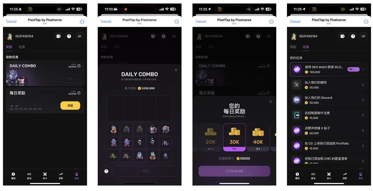 在奖励页面,目前有三种方式获得额外的金币奖励,第一种是 Daily Combo,可以理解为是每日答题,每日答题的具体答案可以进入 Pixelverse 的 Telegram 中文社群获取,这里鉴叔将社群链接也一并放到简介里,欢迎大家更方便的进入~ 进入 Daily Combo 页面后,我们根据中文社区的提及的数字将宠物放到对应位置即可,比如今天的答案是1–2–13–14,当我们进入到 Daily Combo 页面后,每个宠物按顺序对应一个数字,我们只需要把正确数字的宠物拖进去即可获得奖励。 这个奖励获得的很多,建议每日必做。