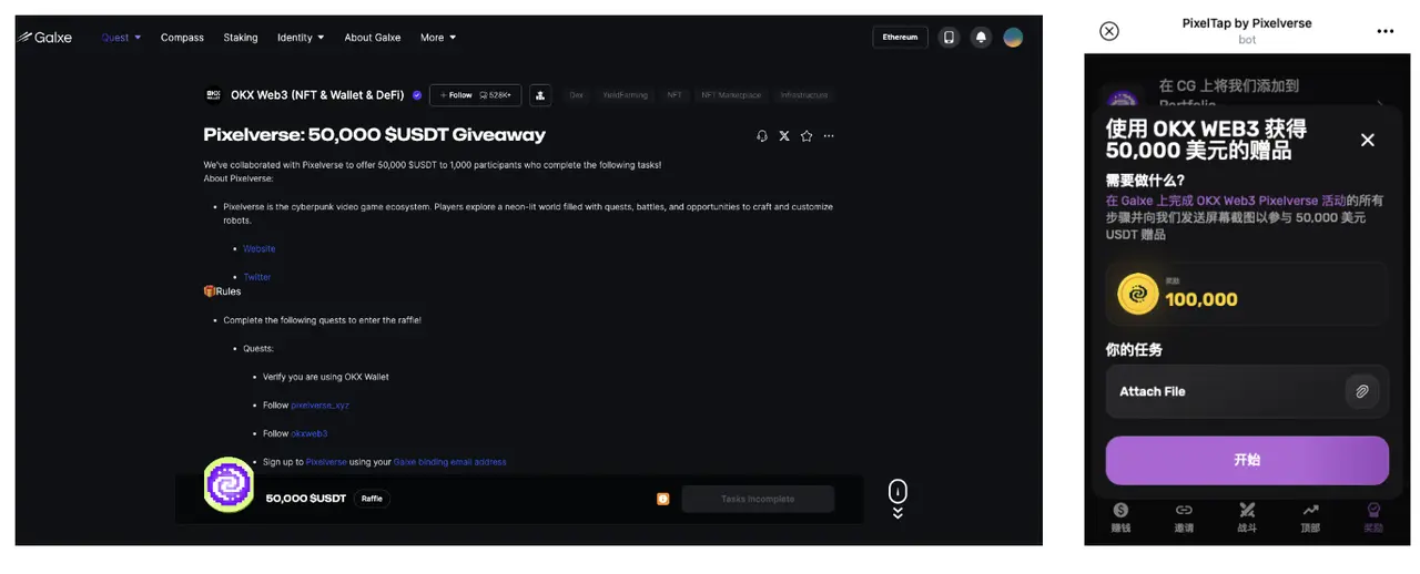 目前Pixelverse 最近和 OKX Wallet 推出了价值50000U的抽奖活动,完成指定任务后将抽取1000人瓜分奖励,任务内容主要是转推等社交任务,难度并不高,活动将于7.1日结束,参与的同时还可以获得额外金币奖励,感兴趣的朋友看一下。