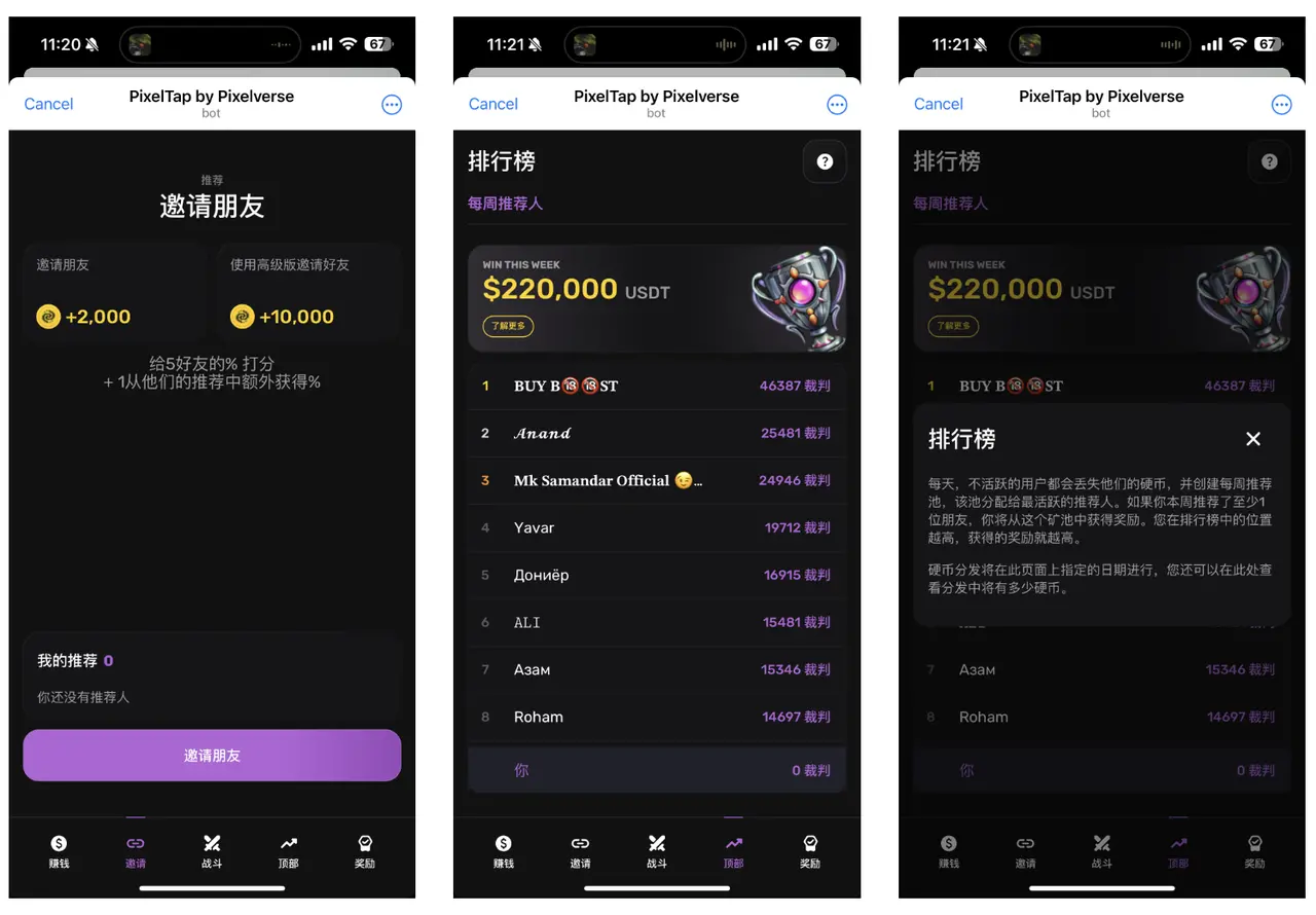 进入顶部页面,我们可以看到当周的邀请排行榜,游戏每天的奖池都会收集不活跃用户的部分金币并加入该奖励池用于激励邀请人,每周邀请排行榜上的位置取决于一周内邀请的推荐人数量, 排名越高,您从池中收到奖励就越多。比如本周的第一名邀请了近 2 万名用户,那么他就将获得大部分的金币奖金。在这里也欢迎大家输入鉴叔的邀请码进入游戏,邀请码会放到简介里~