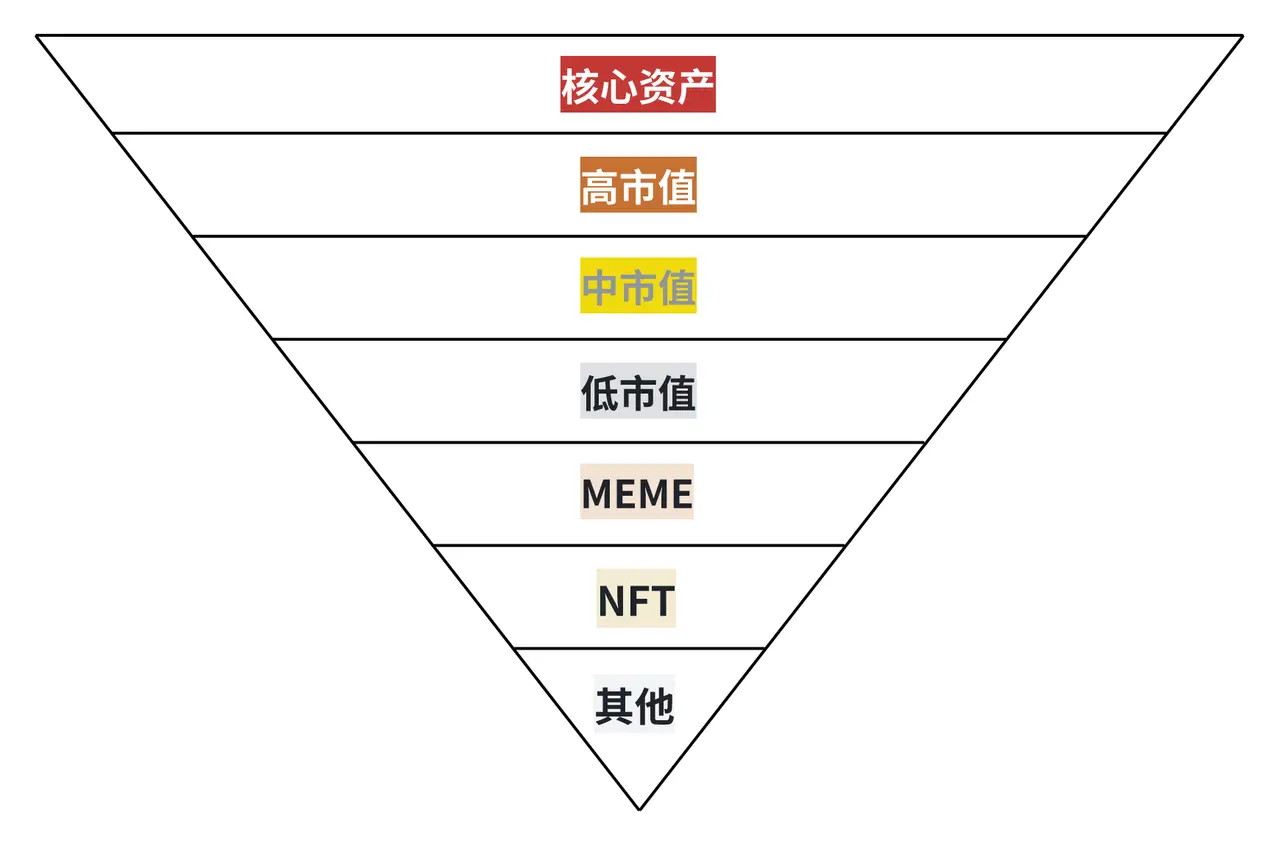 核心资产(即 BTC 和 ETH )- 高市值 — 中市值 — 低市值 — Meme — NFT /其他