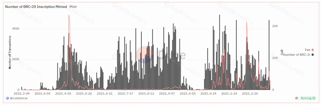 从 Inscriptions 的铸造数据来看,铸造数量趋于稳定,保持在较高的数量。