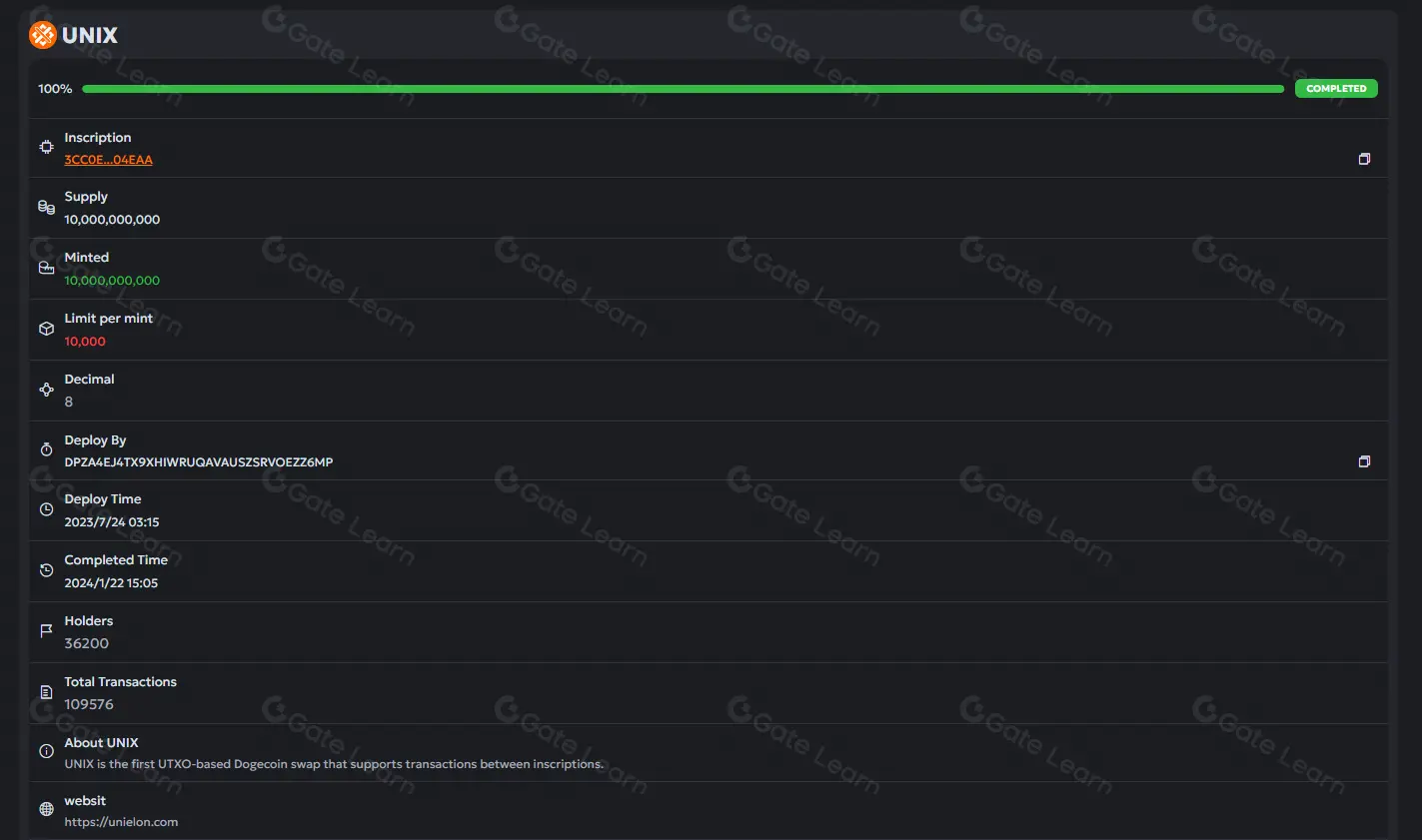 $UNIX 是第一个基于 UTXO 的狗狗币交换,支持铭文之间的交易。目前持有者 36200 人,总交易量 109576。