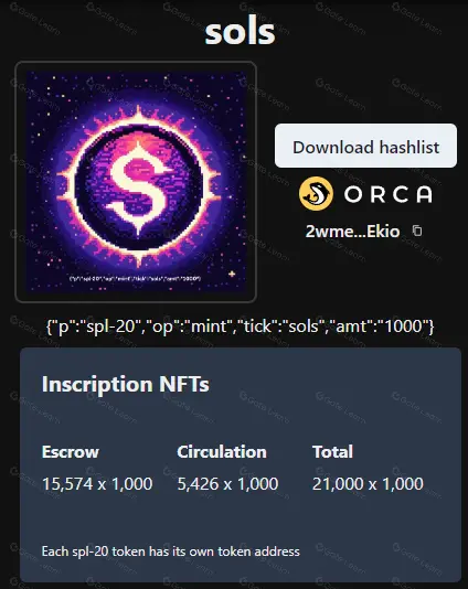 Solana 链首个铭文系的代币 SOLS 是基于类似 Ordinals 协议 BRC20 的 SPL-20 创建的,总量为 21000 张。SPL20 同样是一组带有固定规则和格式的 JSON 文本类铭文。它与 BRC20 的不同之处在于,它改变了“P”字段的协议名称“P”:“spl-20”。