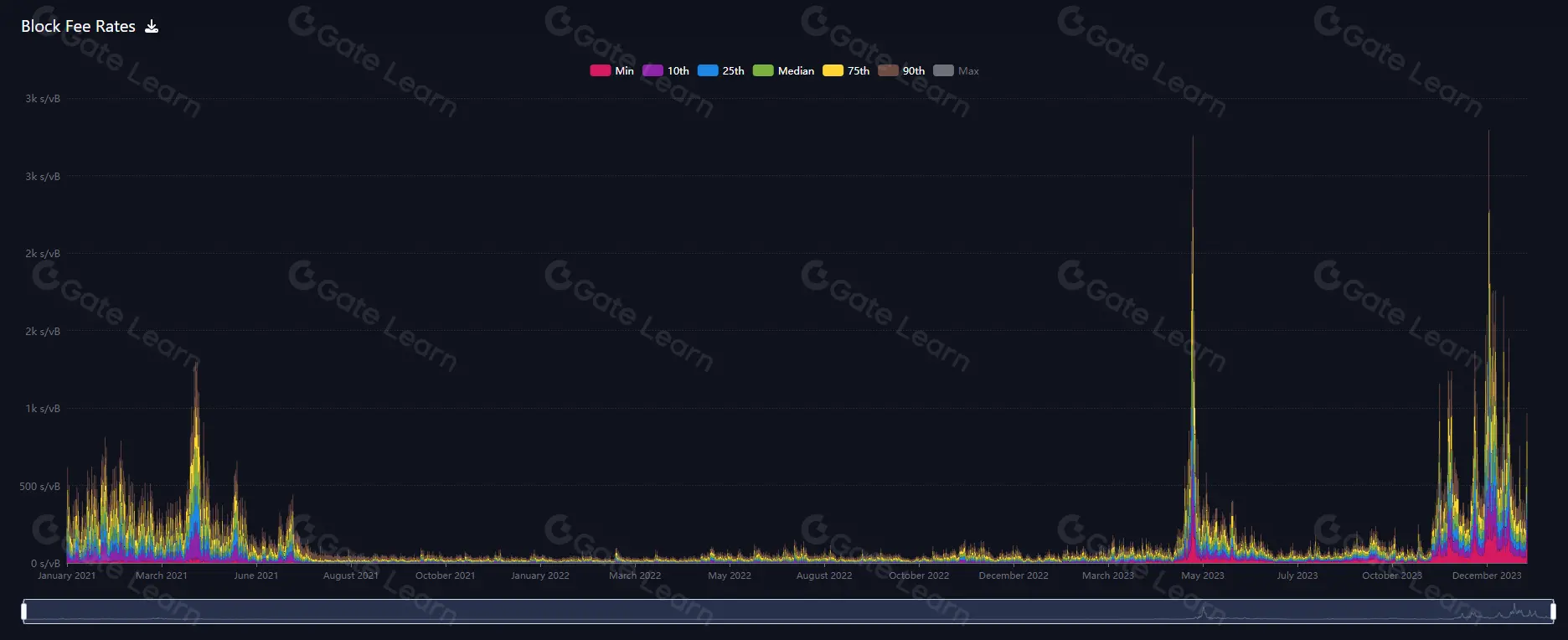 然而,这也导致了比特币链上 Gas 的不断攀升,根据 Mempool.space3 年期区块费率数据显示,在 2023 年 5 月和 2023 年 11 月,区块费率直线飙升,最低确认 Gas 在最高峰时甚至飙升至 600 s/vb,创下了过去三年内的最高水平。