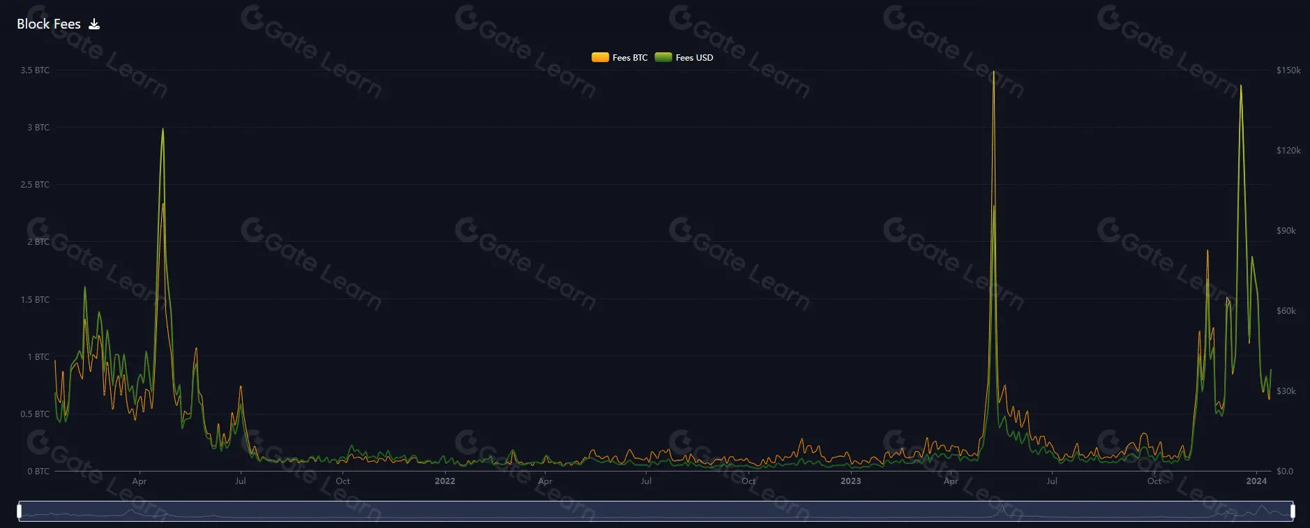 而根据 Mempool.space3 年期区块总费用数据显示,在 2023 年 5 月和 2023 年 11 月,都出现了单日区块总费用接近 3.5BTC,为 3 年来最高记录。