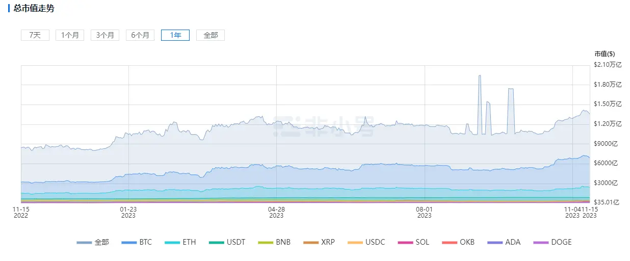 自 2017 年以来,加密项目的数量多了几倍,其中创新型的项目也与日俱增。截止 2023 年 11 月 14 日,加密货币总市值达到了 1.38 万亿美元,其中以太坊市值为 2,500 亿美元,占加密货币总市值的 18%,呈现出惊人的增长。