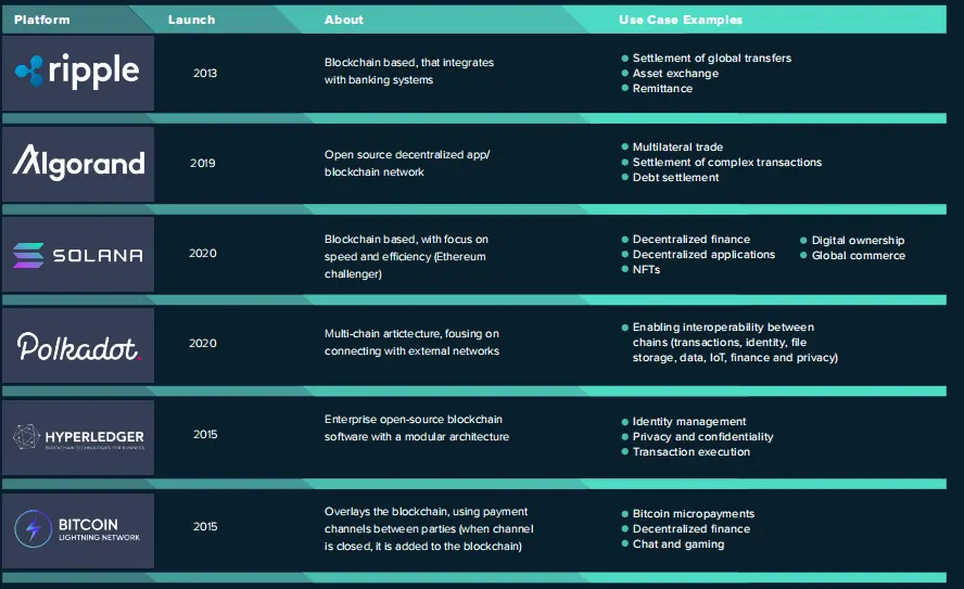 以太坊生态产生的创新对于加密支付生态的建设打下了坚实的基础,随着新一代区块链生态的发展,在解决跨境和 C2B 支付方面,出现了如 Ripple、Polkadot、Solana 等几个平台。
