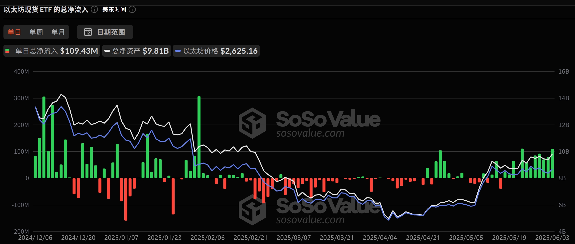 萌币网 消息,据 SoSoValue 数据显示,以太坊现货 ETF 连续净流入天数创年内新高(5 月 16 日至 6 月 3 日),持续 12 日净流入。截至目前,以太坊现货 ETF 总资产净值为 98 亿美元,ETF 净资产比率(市值较以太坊总市值占比)达 3.11%,历史累计净流入已达 32.2 亿美元。