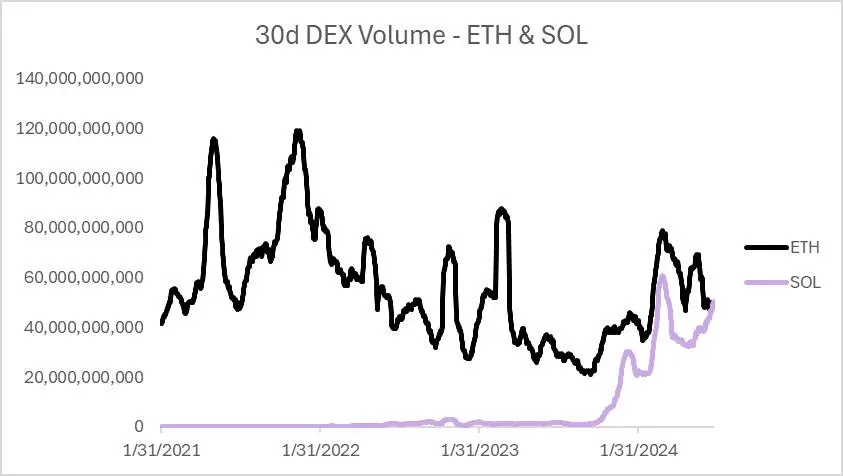 另外,Blockworks Research 研究员 Ryan Connor 在 X 平台最新发文称,Solana 在过去 30 天的去中心化交易所(DEX)交易量上还首次超过了以太坊,现在是按此标准衡量使用最多的链。